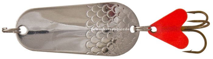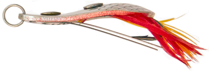 Hier ist nochmal eine spezielle Form eines Blinkers zu sehen, ein sogenannter „Krautblinker“ – mit zusätzlichen Federn. Die kleinen „Drahtbügel“ stehen über den Hakenspitzen und sollen so Hänger verhindern, die Federn sollen einen weiteren Reiz auf den Raubfisch ausüben.